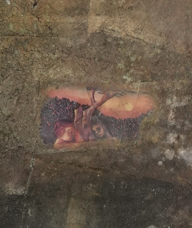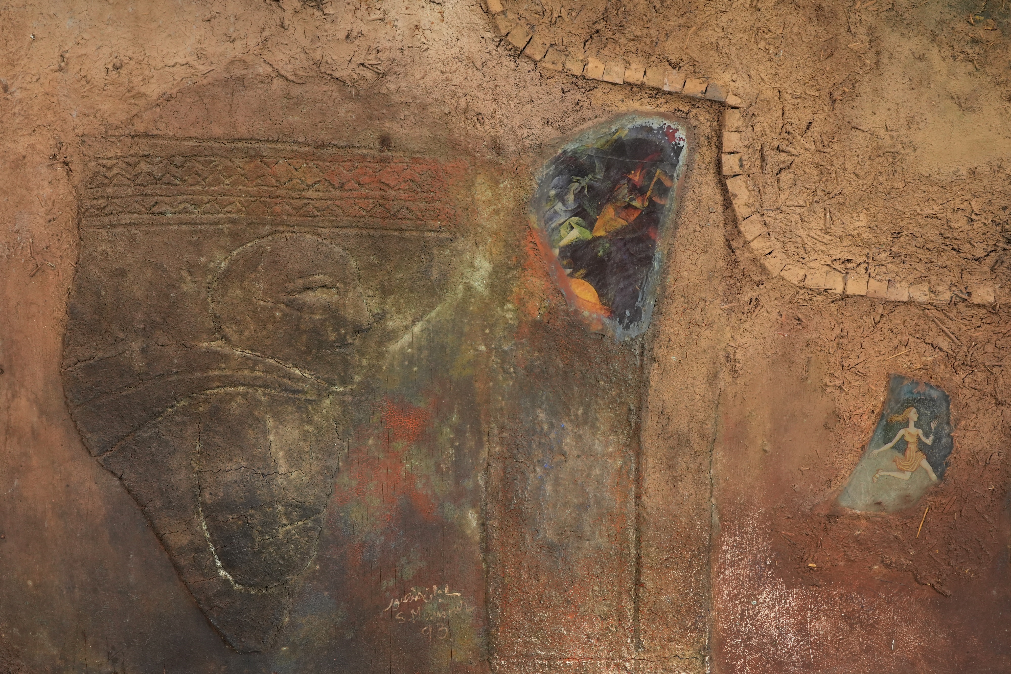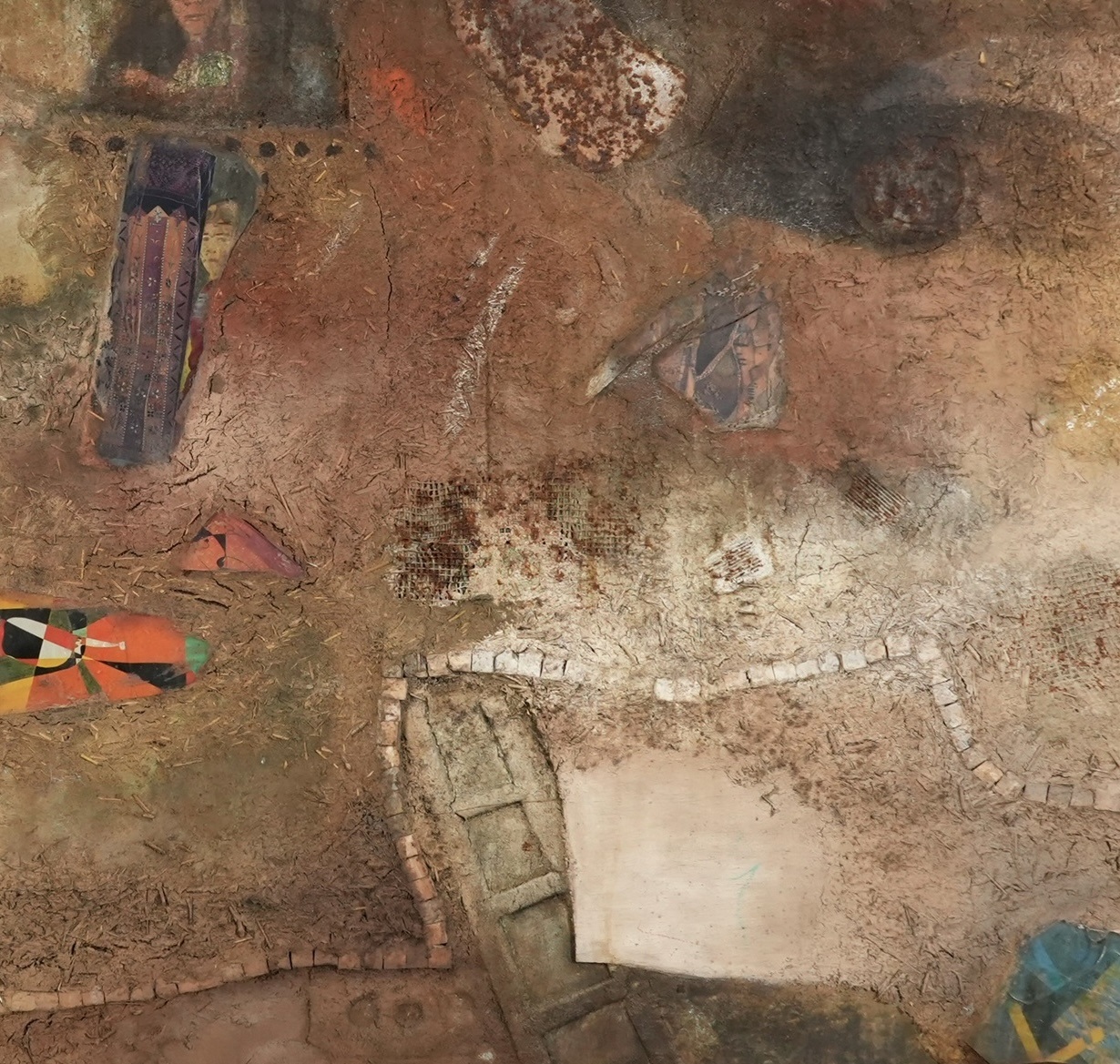 But these close personal ties with mud as a medium are not solely rooted in Mansour’s past. Visible in this work are small inclusions created by his children, negotiated in exchange for pocket money in their youth, and functioning as mementos of their childhood around their father’s art studio spaces. The location of these pieces can be determined on the reverse, which displays small sections distinct from the primary wooden plane. Other additions include fragments of works by other artists such as Joan Miró and Mansour's fellow New Visions member Nabil Anani. The properties of mud itself as an artistic material are also crucial for this, when dried staying firm enough to hold these small fragments as well as numerous other inclusions, formed from glass and other materials. It becomes solid enough to work as a base for applied colour, and when soft can manipulated sculpturally and incised with further detail.
