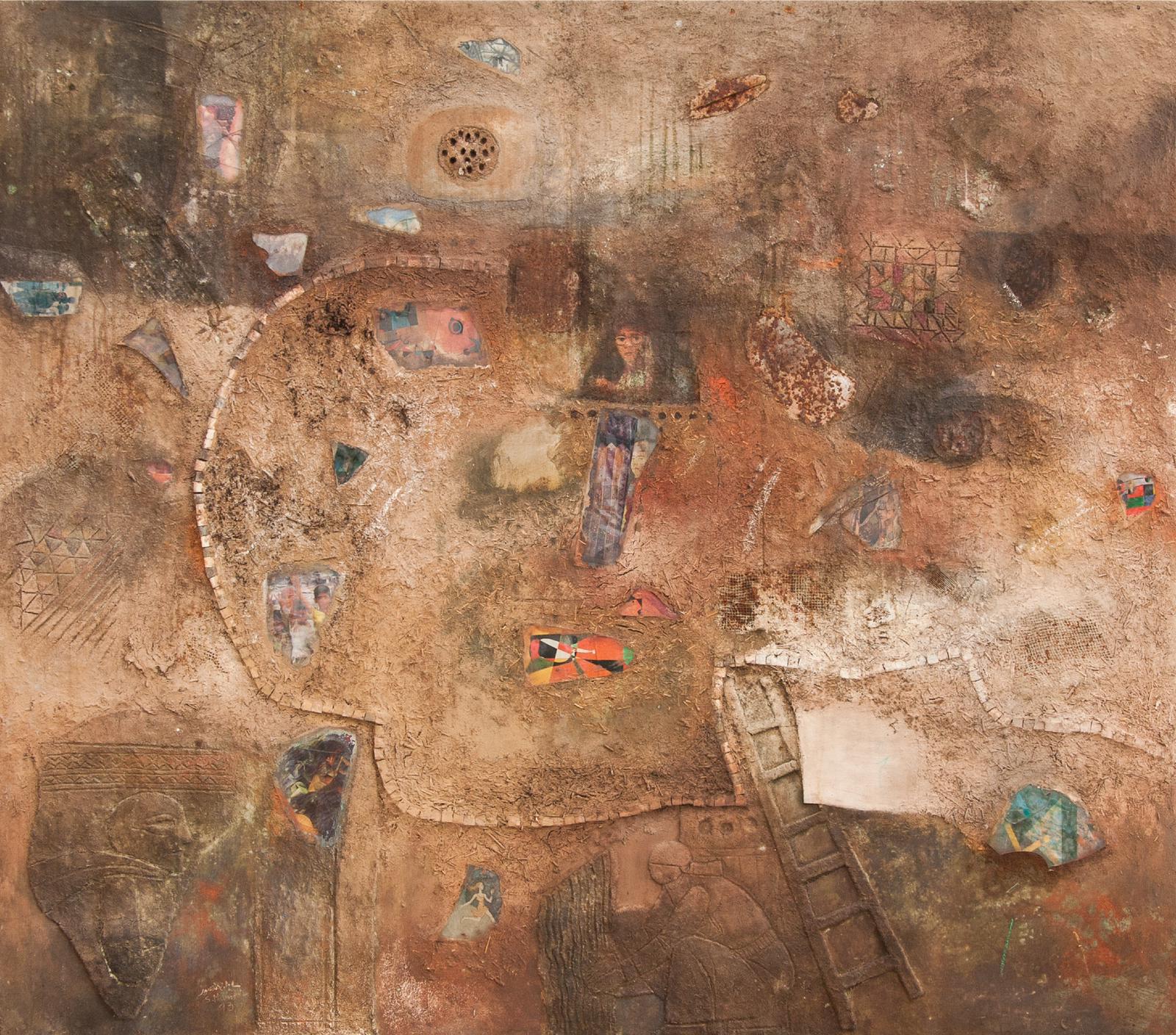 Born in the small village of Birzeit in 1947, Sliman Mansour is recognised as of the greatest living Palestinian artists. His contributions to Palestinian art go beyond his own creative output, having held numerous roles in artistic institutions also; serving as head of the League of Palestinian Artists (1986-1990), director of the Al-Wasiti Art Center in East Jerusalem (1996-2003), and as a member of the founding board of directors of the International Academy of Art Palestine, established in Ramallah in 2004. Mansour’s oeuvre is diverse, across traditional media like oils but also branching into sculpture and producing cartoons. One area of Mansour’s work has become especially well known however – his pieces created using natural materials, most notably mud. Lot 15 in our upcoming Modern and Contemporary Middle Eastern Art Auction, Promenade to Beit Dajan is an exceptional work of this type by Mansour, produced in 1993.