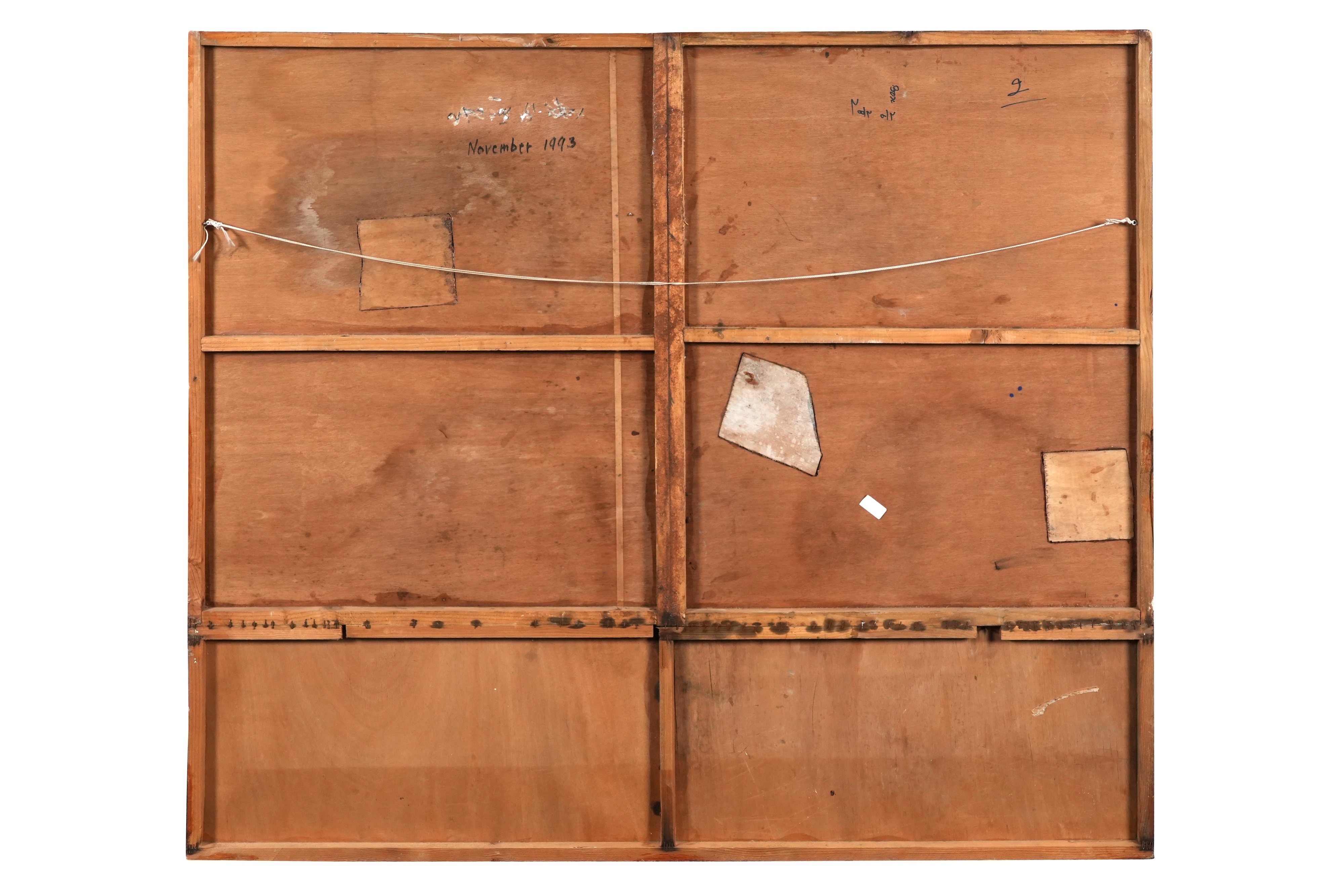 The size of Promenade to Beit Dajan, measuring 119cm x 236cm, is also remarkable given its year of production, 1993. At this time, Mansour was himself covertly transporting his work across Palestine, meaning that the scale of his works was entirely confined to the dimensions of his small Volkswagen Polo. In the years following, Mansour himself noted that this size was the greatest which his vehicle would allow, making Promenade to Beit Dajan an exceptionally rare example of a large-scale early mud period work.
