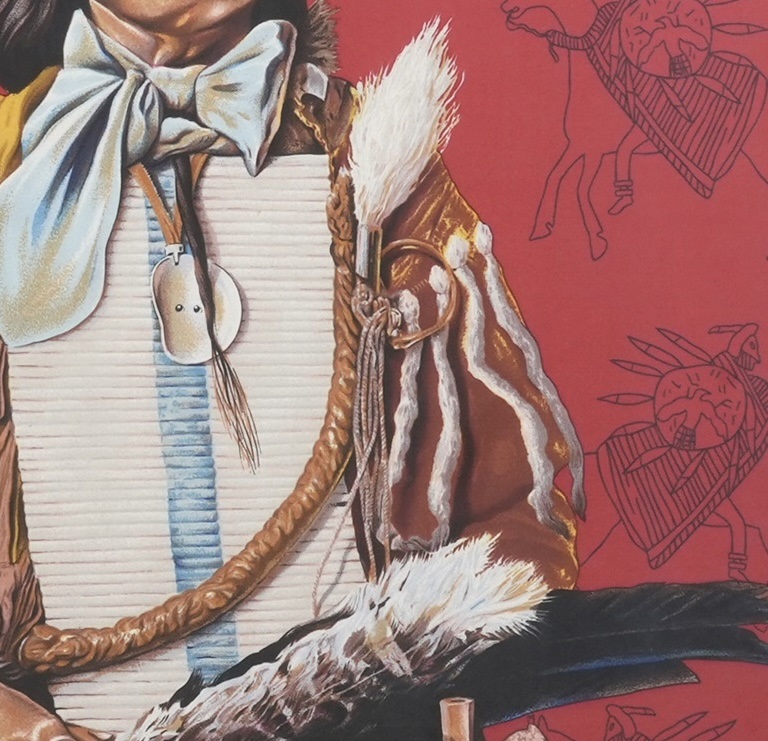 Sharitarish’s portrait was first painted by Charles Bird King (1785 - 1862), an American portraitist who became known for his work with native american subjects. King’s style has an continues to be divisive - with some criticising his portrayals as coming to close to the trope of the “noble savage” (which stereotyped and infantalised non-white figures as both morally ‘pure’ and culturally backwards). The attention to detail in King’s portraits however, especially in his subject’s clothing, has been praised by some for its recording of the material culture of their communities. Nevertheless, it is King’s portrait which was later reinterpreted by Oliver in his work for Hermès as part of a respectful homage to Native American heritage.